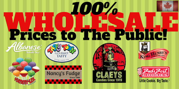 Since 2008 we've offered excellent wholesale pricing on some of the most popular candy, confectionery and snacks. Our Customers are Candy Stores, Gift Stores, Specialty Stores. Gas Bars. Convenience Stores, Farm Markets, Hardware Stores and Pharmacies. We receive orders weekly from our suppliers so you are guaranteed the freshest candy possible. We are confident that after your volume discount, you will not find better wholesale prices on Claeys Candy, Combo Snacks, Kervan Halal Bulk Candy and Salt Water Taffy. Also we have a flat rate shipping fee of $35.00 in the GTA. Indicate this option at check-out if you are in Toronto, Misssissauga, Etobicoke, North York, Scarborough, Guelph. Kitchener Waterloo, and Hamilton and area. Regular shipping fees applies to the rest of Canada.